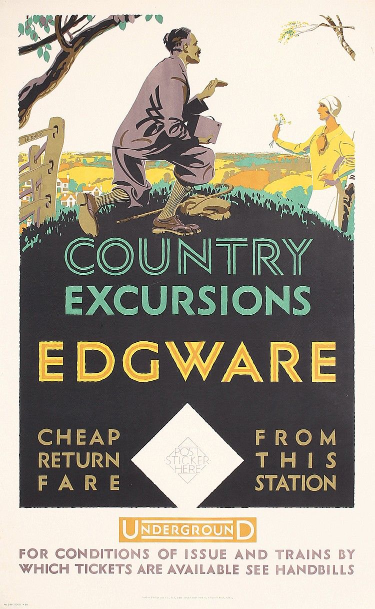 Edgware, another travel destination for early Underground posters with open green spaces, is similarly presented here as a pretty bucolic village where “country excursions” could be found.