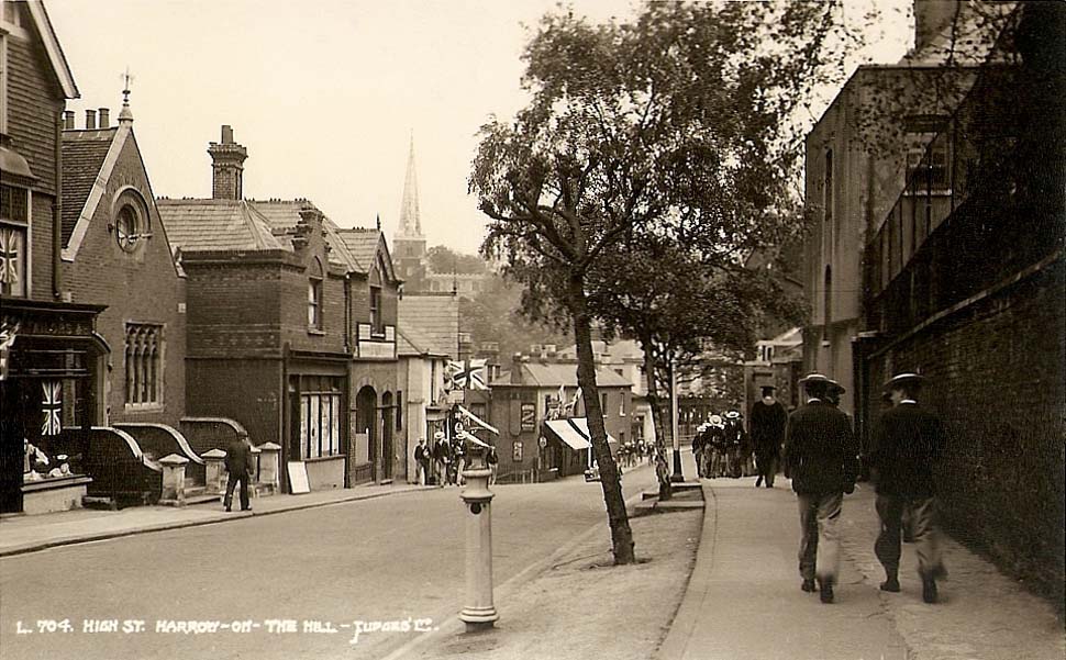 In the picture above, the characteristic white straw boaters of the famous Harrow public school can be seen on two of the boys as they march in parade up the High Street in Harrow with the church spire of Harrow-on-the-Hill in the background.