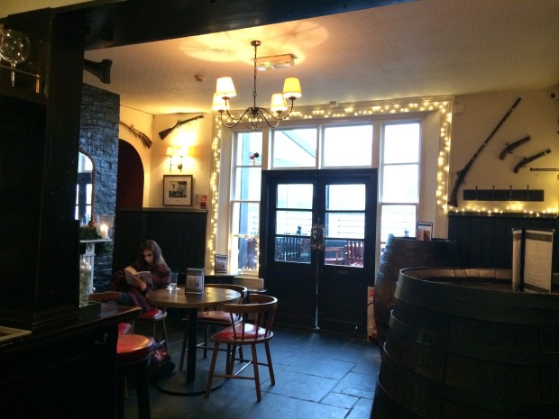 Once we had our drinks, we wandered through the wood-panelled hallways to find a waterside terrace. It was practically deserted, but we chose the warm interior and the log fire to sit beside in the end.